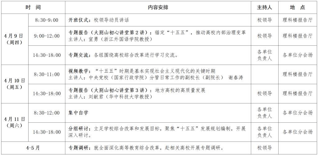 本次培训综合运用专题报告、视频教学、分组研讨等多种形式,围绕党的二十届四中全会精神、树立和践行正确政绩观、“十五五”发展规划、深化综合改革等内容,开展学习研讨。培训日程安排如下: