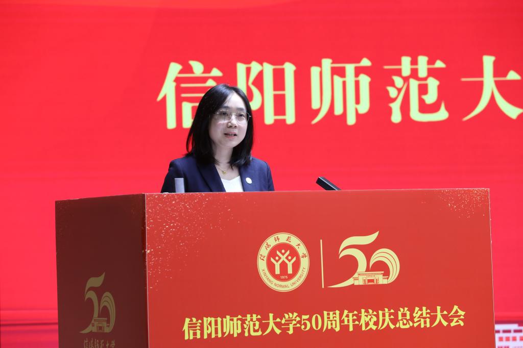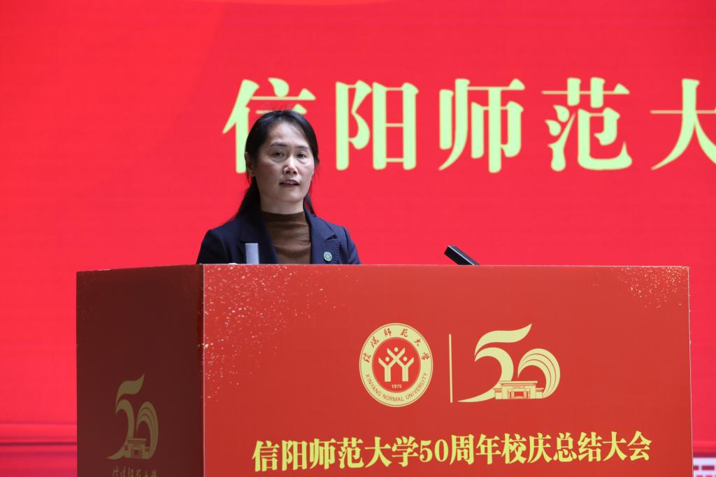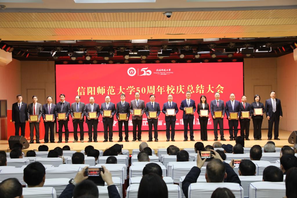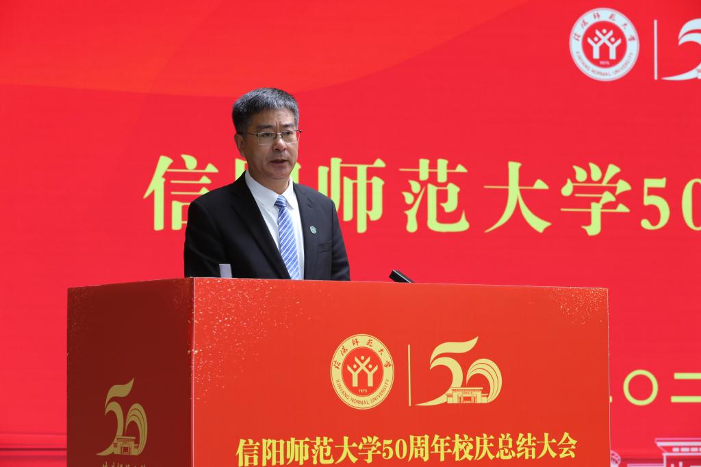 信阳师大新闻网讯 五秩芳华共铸辉煌,凝心聚力再谱新篇。11月10日,学校在理科楼报告厅召开50周年校庆总结大会。全体校领导、中层干部、校庆工作人员代表、联络员代表、志愿者代表、专职辅导员、离退休教职工代表、校友代表550余人参加会议。会议由校长余本海主持。