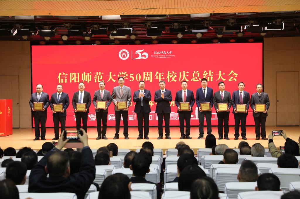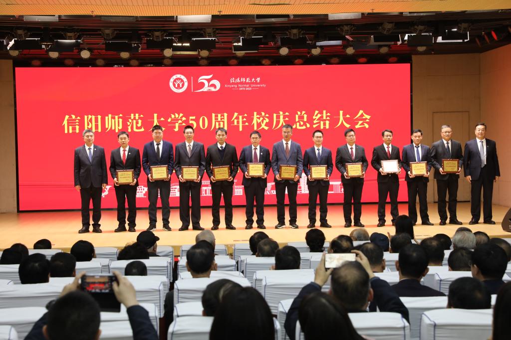 校党委副书记、工会主席岳宗德宣读了《关于对学校50周年校庆工作表现突出的单位予以表彰的决定》,对党委办公室等16个学校50周年校庆工作先进集体、生命科学学院等11个学校50周年校庆学术活动优秀单位、数学与统计学院等10个学校50周年校庆校友工作优秀单位进行了表彰。校领导为获奖集体颁发了奖牌。