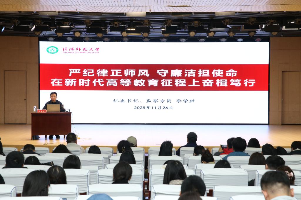 信阳师大新闻网讯 11月26日,校纪委书记、监察专员李荣胜教授在理科楼报告厅为全校240余名新入职教职工作题为《严纪律正师风 守廉洁担使命 在新时代高等教育征程上奋楫笃行》的主题报告。报告由教务处负责人主持。