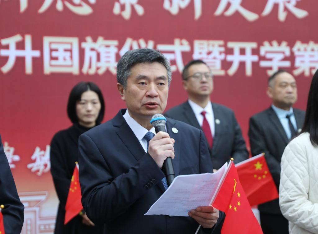 在飘扬的国旗下,校党委书记王文鹏以“不负春光起好步 勇担使命建新功”为主题,为师生讲授“开学第一课”。他指出,此次升旗仪式既是一次庄严的精神洗礼,也标志着新学期的全面起航。当前,学校正处于“更名大学后提质进位的关键期、申博攻坚的冲刺期、‘十五五’规划的开局期、建校五十年后的起步期”这一“四期叠加”的历史阶段,他勉励全体师生要成为有准备、有担当、有定力的人,把握机遇,迎难而上,主动将个人成长融入时代洪流,在发展大局中奋进新征程。他寄语青年学子,要在课堂上下苦功,让学识更有厚度;在实践中练真功,让能力更有硬度;在日常中修品行,让人格更有温度,在拔节生长中迈上新台阶。