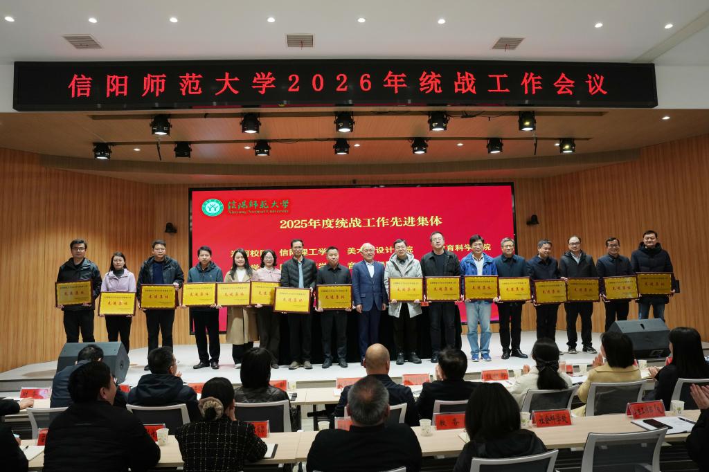 会议表彰了2025年度统战工作先进集体、统战工作先进个人、建言献策先进个人和社会服务先进个人等,民盟信阳师范大学总支主委王玲玲,淮河校区党工委副书记、统战委员李国峰,铸牢中华民族共同体意识研究基地首席专家、教育科学学院教授郑雪松,文学院民族宗教工作联络员崔越进行了交流发言。