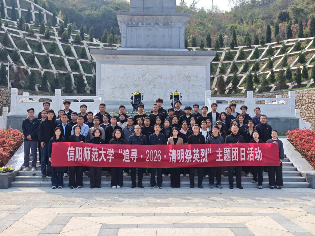 信阳师大新闻网讯 青山埋忠骨,热血铸英魂。为传承红色基因、赓续红色血脉,引导全体师生崇尚英雄、缅怀先烈、争做先锋,3月31日,校党委副书记、工会主席岳宗德带领青年师生代表前往信阳市烈士陵园、柳林革命纪念馆,开展“追寻·2026·清明祭英烈”主题团日活动。