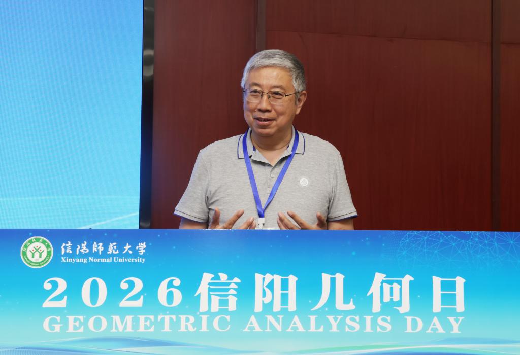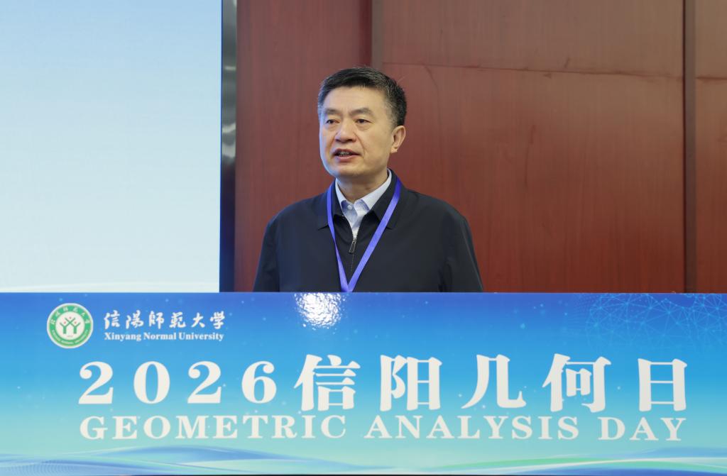 信阳师大新闻网讯 4月27日,2026信阳几何日研讨会在我校开幕。著名数学家、中国科学院院士、北京大学田刚教授出席会议并致辞。来自北京大学、浙江大学、上海交通大学、复旦大学、武汉大学、中国人民大学、华中科技大学、厦门大学、国防科技大学、中国科学院等高校及科研院所的30余位几何分析领域专家学者参加研讨会。校长余本海、副校长王娟出席会议,数学与统计学院领导班子及几何方向团队全体师生参会。开幕式由王娟主持。