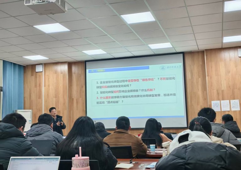 信阳师大新闻网讯 12月12日,应商学院邀请,华中科技大学经济学院宋德勇教授在经管楼308会议室分别作了“从‘绿色悖论’到‘双化协同’:智能化转型与企业碳排放”与“高质量国家社科基金项目申报书撰写的技巧与思路”的专题报告。讲座由该院副院长杜辉主持,部分师生参加。