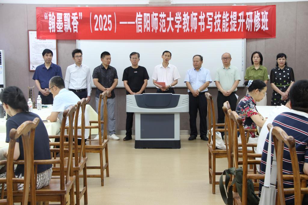 信阳师大新闻网讯 翰墨书写教育情,丹青描绘中国梦。7月4日,由校工会主办、教职工书法协会和教师教育学院承办的翰墨飘香(2025)教师书写技能提升研修班开班。校党委副书记、工会主席岳宗德及50余名书法爱好者参加。仪式由校工会副主席余纪珍主持。