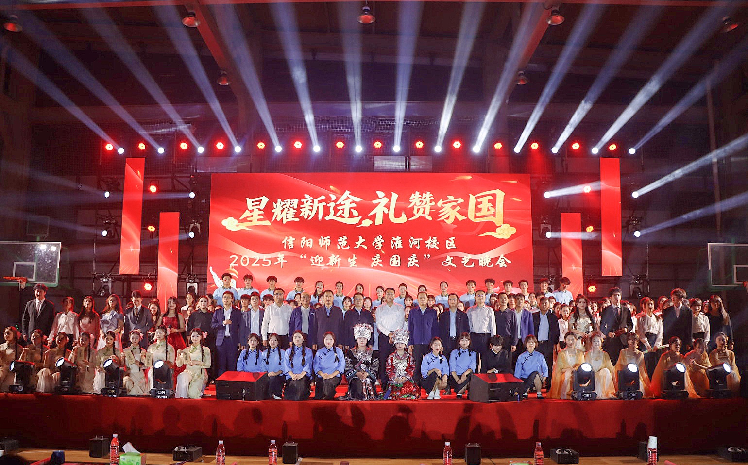 信阳师大新闻网讯 9月28日,淮河校区在东体育馆二楼举办“星耀新途 礼赞家国”2025年“迎新生·庆国庆”文艺晚会。校区党工委、管委会各部门、学部、书院负责人,以及3000余名师生代表观看演出。