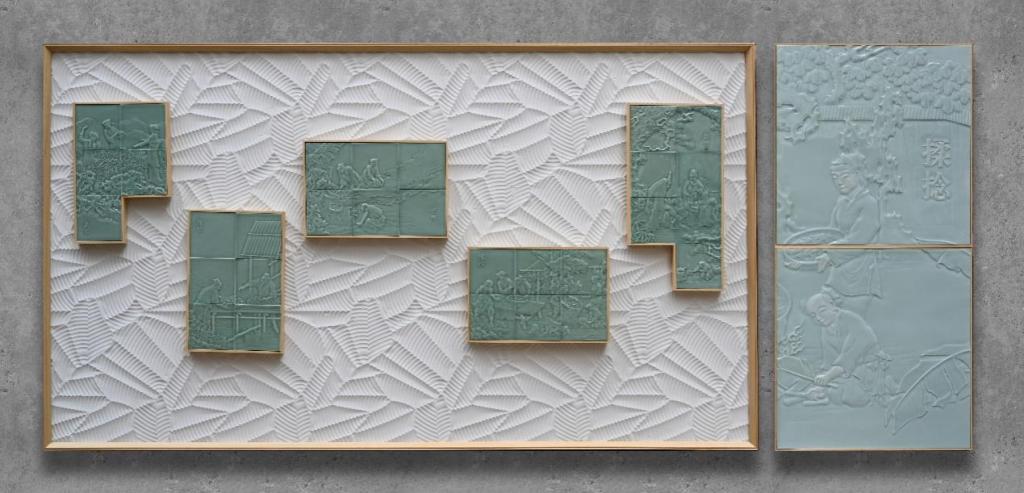 《茶乡春韵》以信阳地域茶文化为创作核心,创新采用陶瓷浮雕与马赛克复合工艺,生动呈现毛尖茶从采摘、制作到品饮的完整流程。作品既再现了悠远的茶史民俗与秀丽的茶山风貌,更以艺术语言诠释 “茶韵融校园” 的育人理念,让传统文化在创作中焕发鲜活生机。《AI 序曲》则紧扣时代脉搏,以“微观电路”与“宏观城景”为视觉语汇,将前沿科技元素与大漆非遗工艺巧妙融合。通过像素化拼贴的艺术表达,作品传递出智能时代对 “秩序与创新” 的追求,构建起科技与人文深度对话的艺术场域。