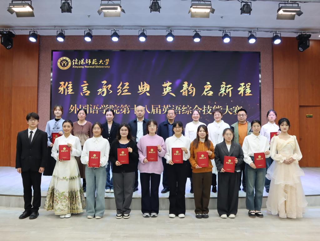信阳师大新闻网讯 11月27日晚,外国语学院在人文楼五育大讲堂举办“雅言承经典英韵启新程”英语综合技能大赛决赛。该院党委副书记高彦伟,副院长余永锋出席比赛,教师赵建军、周雪、郭华、程欣瑜、魏旭担任比赛评委,师生代表200余人共同观看比赛。