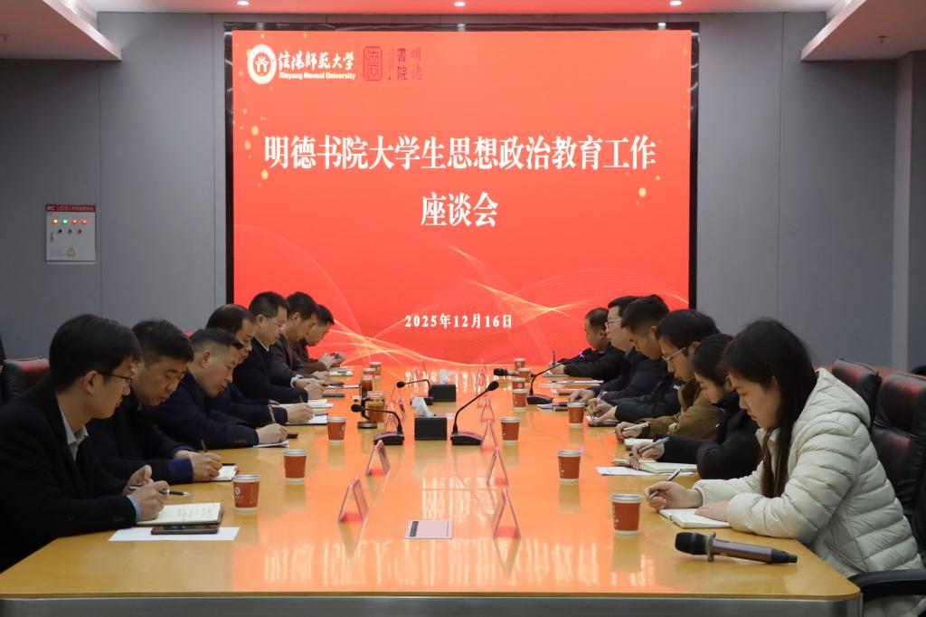 信阳师大新闻网讯 12月16日,明德书院召开大学生思想政治教育工作座谈会,聚焦书院制模式下思政育人创新实践,凝聚育人共识、破解工作难题。座谈会由明德书院直属党支部书记雷梁主持,对接引领班级的相关处级干部、辅导员参加。