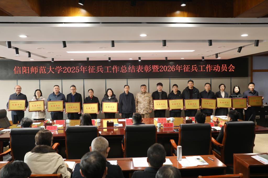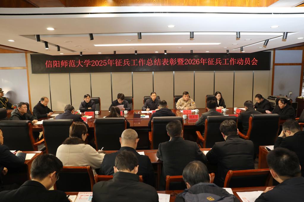 信阳师大新闻网讯 12月18日,我校2025年征兵工作总结表彰暨2026年征兵工作动员会在逸夫楼321会议室举行。校党委副书记、工会主席岳宗德,信阳市浉河区人民武装部部长王建立,校征兵工作站成员及各学院征兵工作领导小组相关同志参会。会议由学工部、武装部部长朱四倍主持。