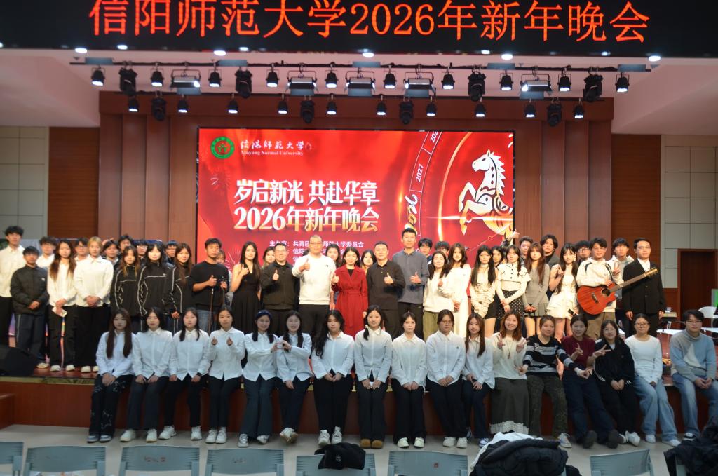 信阳师大新闻网讯 12月17日晚,由校团委主办,校学生会、大学生艺术团、校团委第二课堂、大学生礼仪队联合承办的“岁启新光,共赴华章”2026年新年晚会在逸夫楼报告厅精彩上演。300余名师生齐聚一堂,恭迎新年。