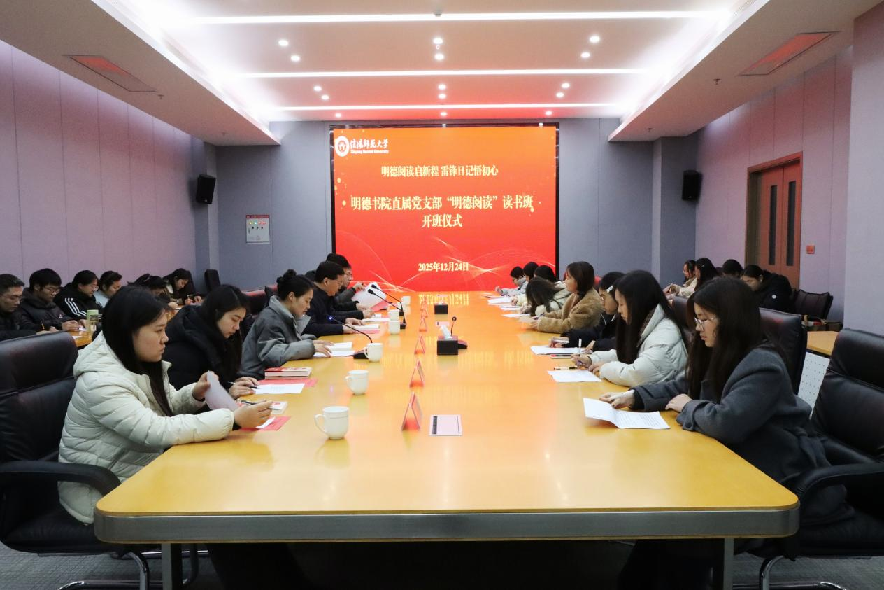 信阳师大新闻网讯 12月24日,明德书院直属党支部“明德阅读”读书班开班仪式暨首次学习活动于淮河校区图书馆第一会议室举行。活动以“明德阅读启新程,雷锋日记悟初心”为主题,通过研读《雷锋日记》,引导青年学子传承雷锋精神,筑牢信仰根基。书院直属党支部书记雷梁、副院长刘锦涛、全体专职辅导员及读书班学员参加活动。