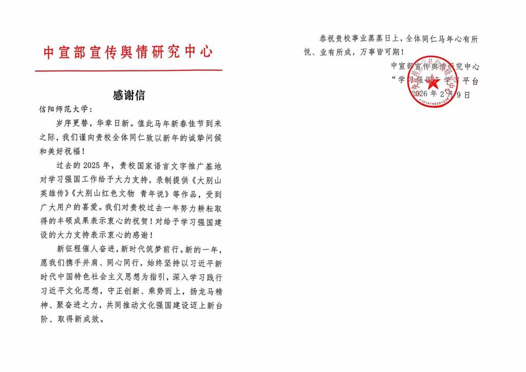 信阳师大新闻网讯 在马年新春佳节来临之际,中宣部宣传舆情研究中心、“学习强国”学习平台向我校国家语言文字推广基地发来感谢信,对基地在2025年度积极开展大别山红色文化主题作品创作、支持“学习强国”平台建设表示感谢。