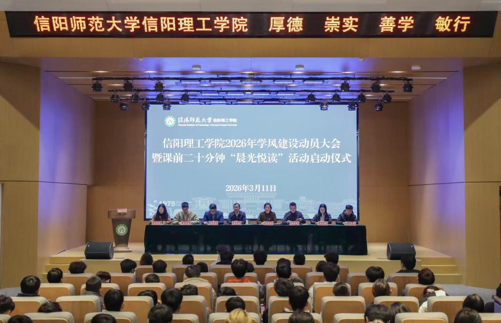 信阳师大新闻网讯 3月11日,信阳理工学院2026年学风建设动员大会暨课前二十分钟“晨光悦读”活动启动仪式在B3教学楼报告厅举行。该院党工委常务副书记李振东,学生工作部部长耿晓菊、教学工作部部长路振国出席会议,2024级、2025级全体辅导员、各班班委、入党积极分子及寝室长参加会议。