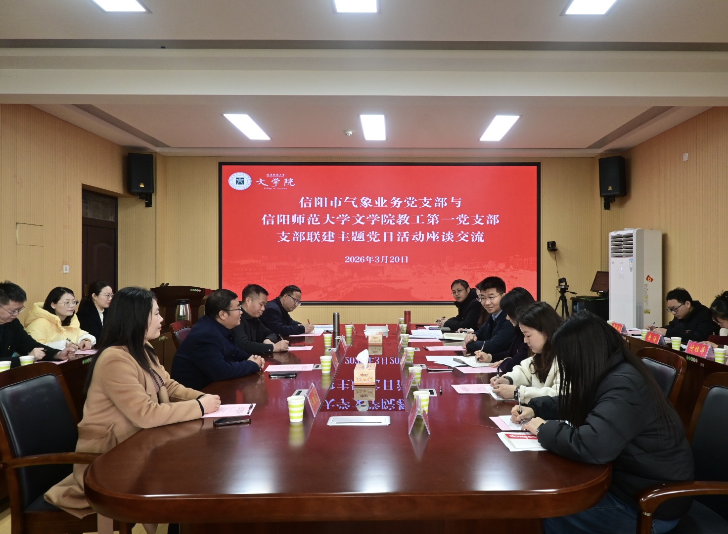 信阳师大新闻网讯 3月20日,文学院教工第一党支部与信阳市气象局业务党支部联合开展“守牢安全底线践初心 深耕淮域文脉担使命”主题党日活动。信阳市气象局党组书记、局长于庆学,党组成员、副局长胡玉梅,文学院党委书记周贤亮等参加活动。