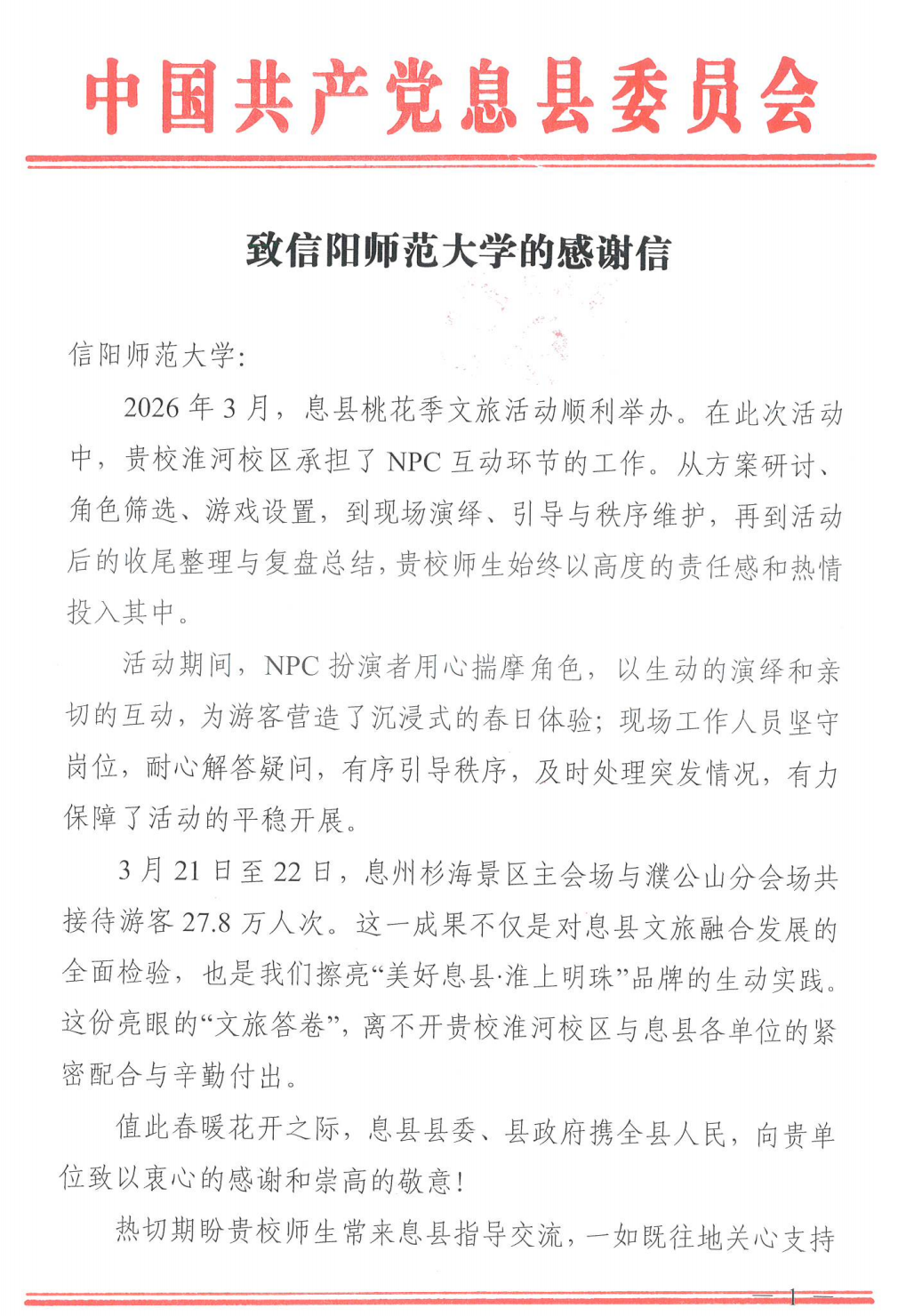 信阳师大新闻网讯 近日,我校收到中共息县县委、息县人民政府感谢信,对我校淮河校区在息县2026年桃花季文旅活动中所参与的工作突出表现予以充分肯定。