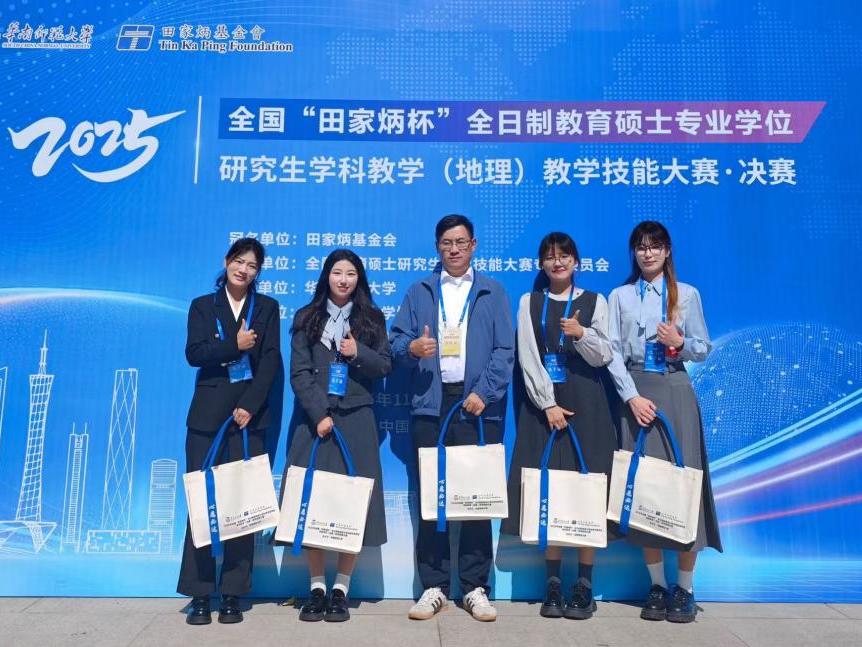 信阳师大新闻网讯 11月21日至22日,2025年全国“田家炳杯”全日制教育硕士专业学位研究生学科教学(地理)教学技能大赛决赛,在华南师范大学顺利举行。经过激烈角逐,我校地理科学学院2024级学科教学(地理)专业硕士研究生徐冰获二等奖,杨艺丹、杨艳分获三等奖,马硕获得优秀教学设计奖。徐丰获优秀指导教师奖。